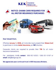 Ghana Card Required for all Motor Insurance Policies December 30, 2025 Share1 Related postsDecember 30, 2025Insurance Pricing and Settlement in Foreign CurrencyRead moreDecember 24, 2025KEK Staff End of Year Thanksgiving ServiceRead moreDecember 24, 2025KEK and Institute of Directors Explore Strategic CollaborationRead more